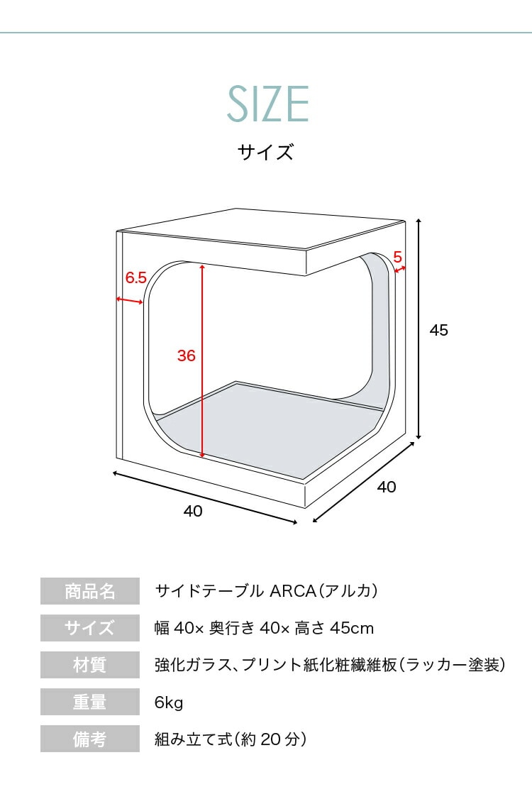 四角いキューブ型をくり抜いたようなスタイリッシュなガラス天板と木製フレームのサイドテーブル『ARCA(アルカ)』。