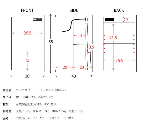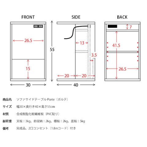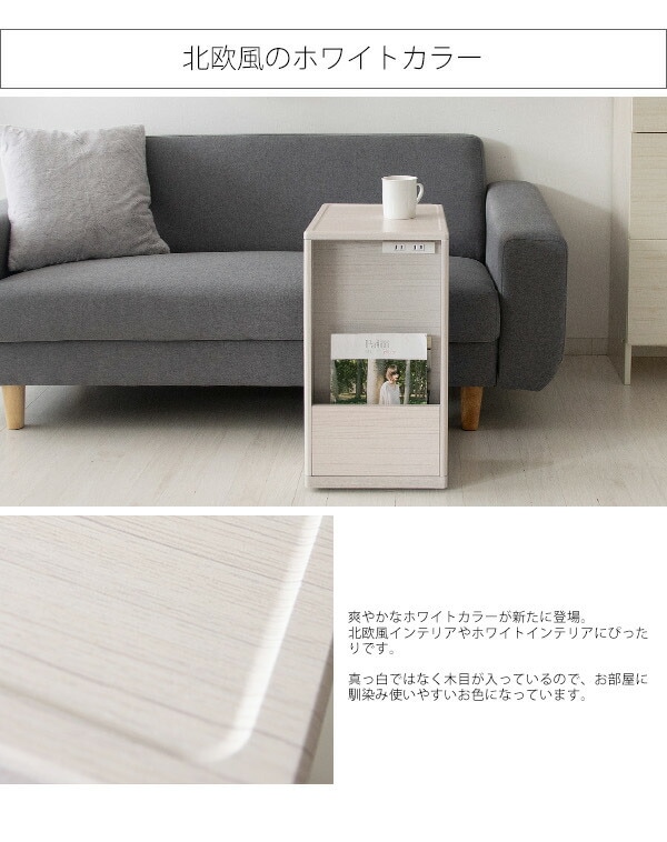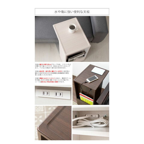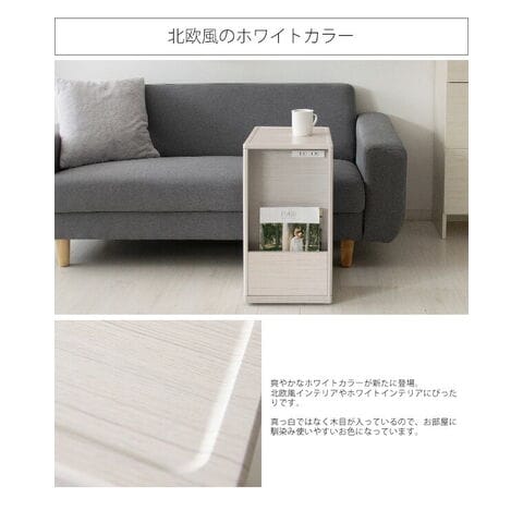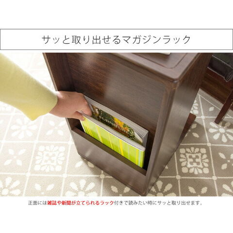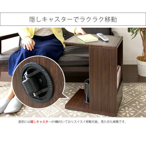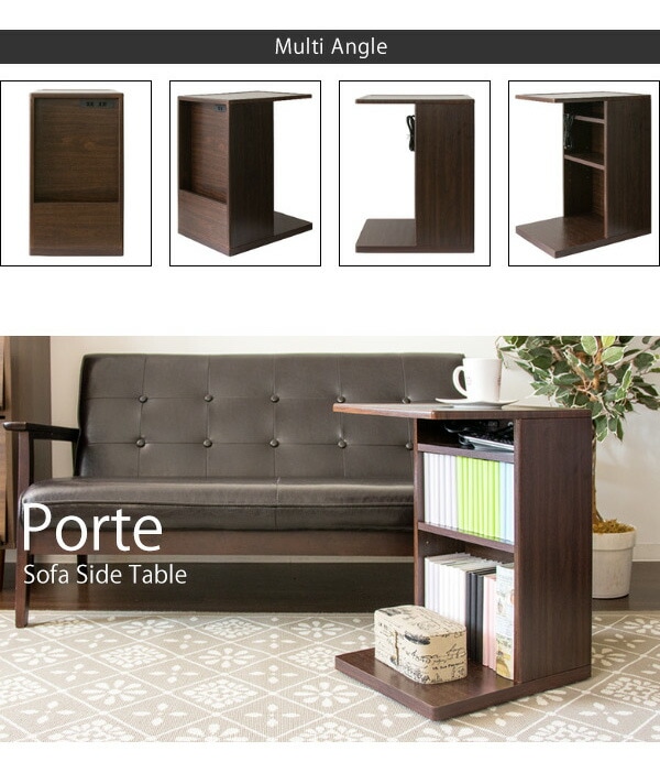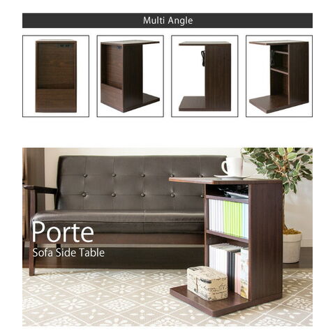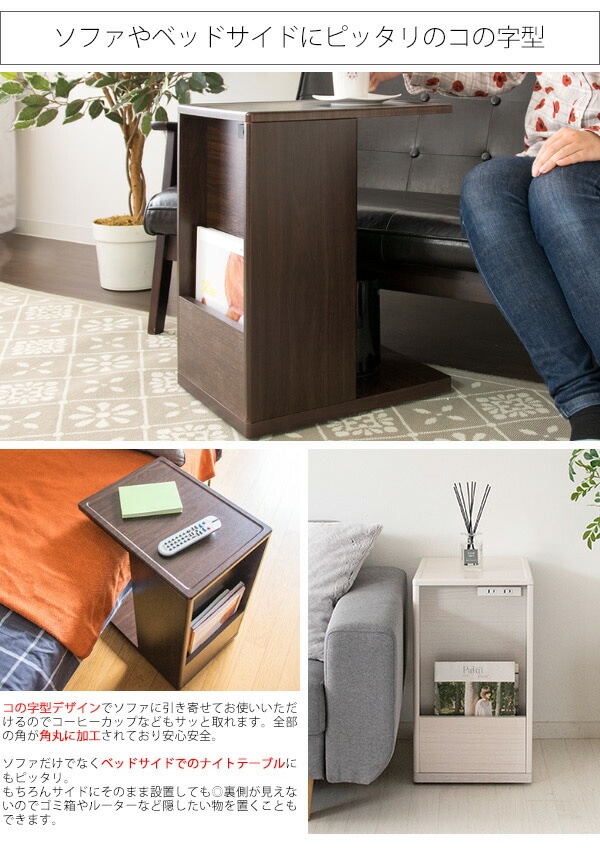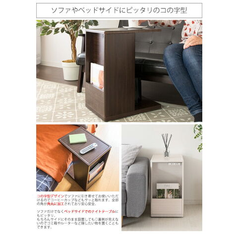 コの字型のデザインでソファ・ベッドに引き寄せてお使いいただけます。正面には雑誌や新聞が立てられるラック、背面は本や雑貨、表に見せたくないゴミ箱やルーターなどを置けます。