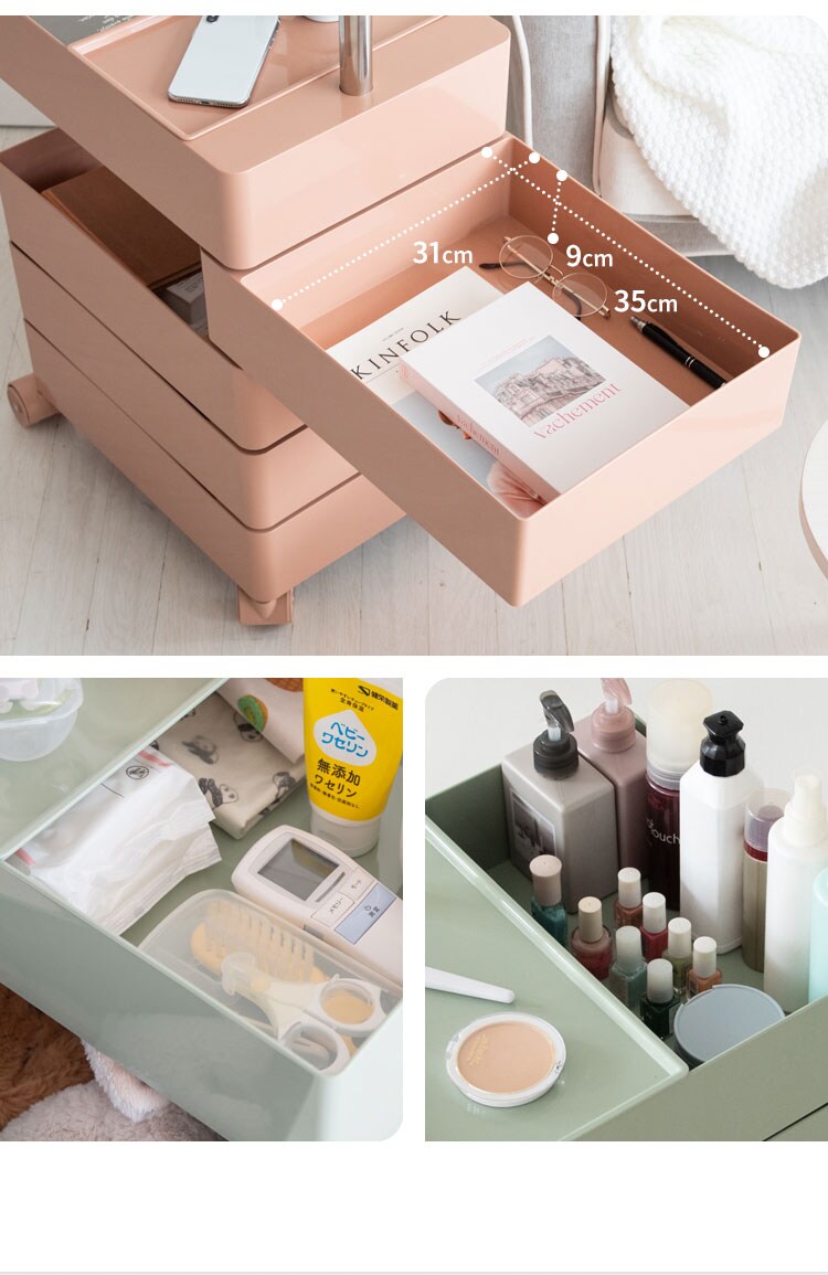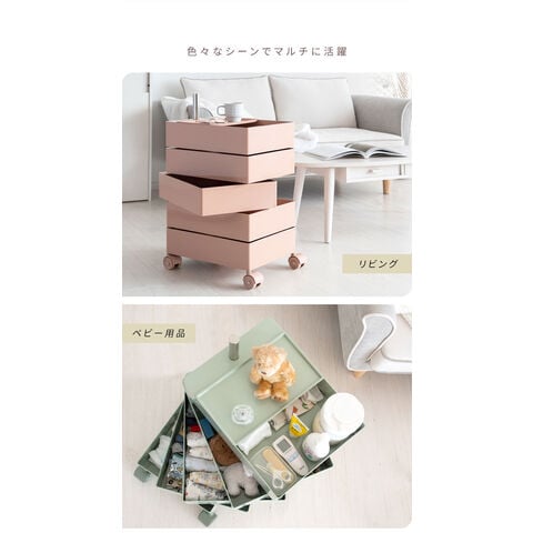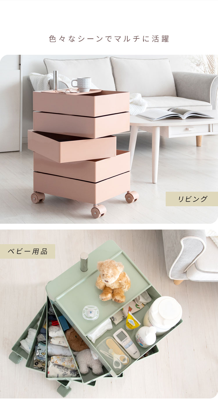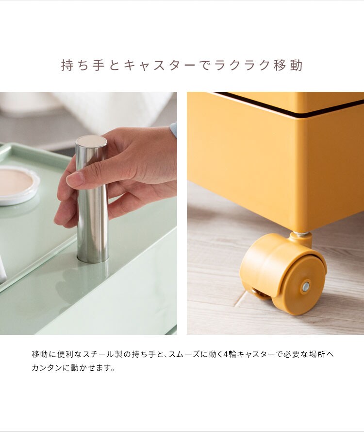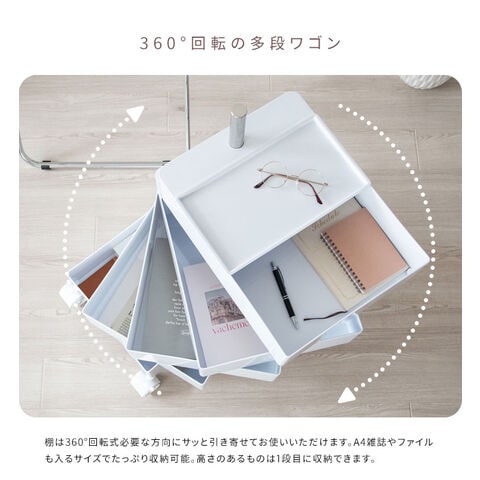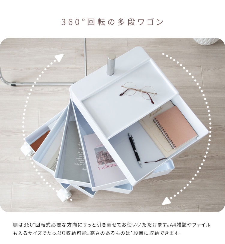 4輪キャスターでラクラク移動できます。棚はそれぞれ360度回転式で取り出しやすく、リビングや寝室、デスクなど色々なシーンでマルチにお使いいただけます。ベビー用品の収納にもオススメ。