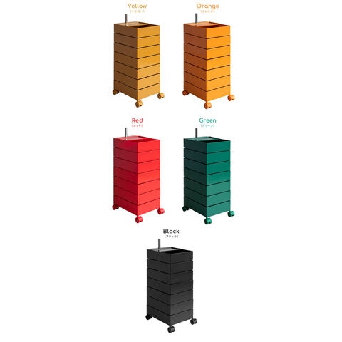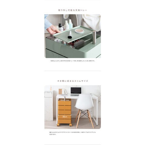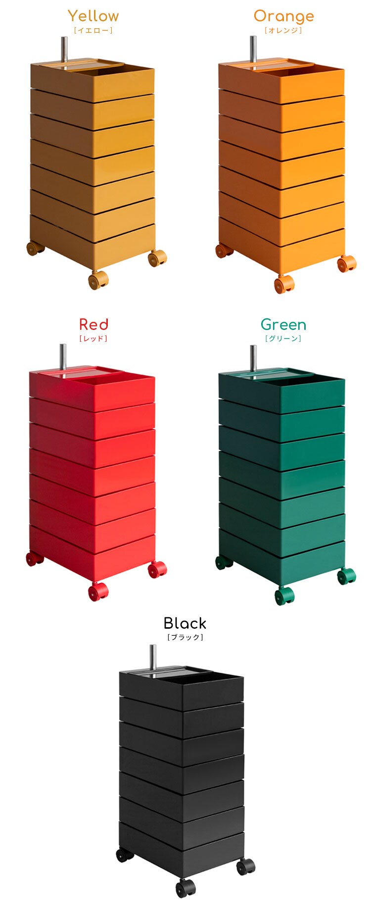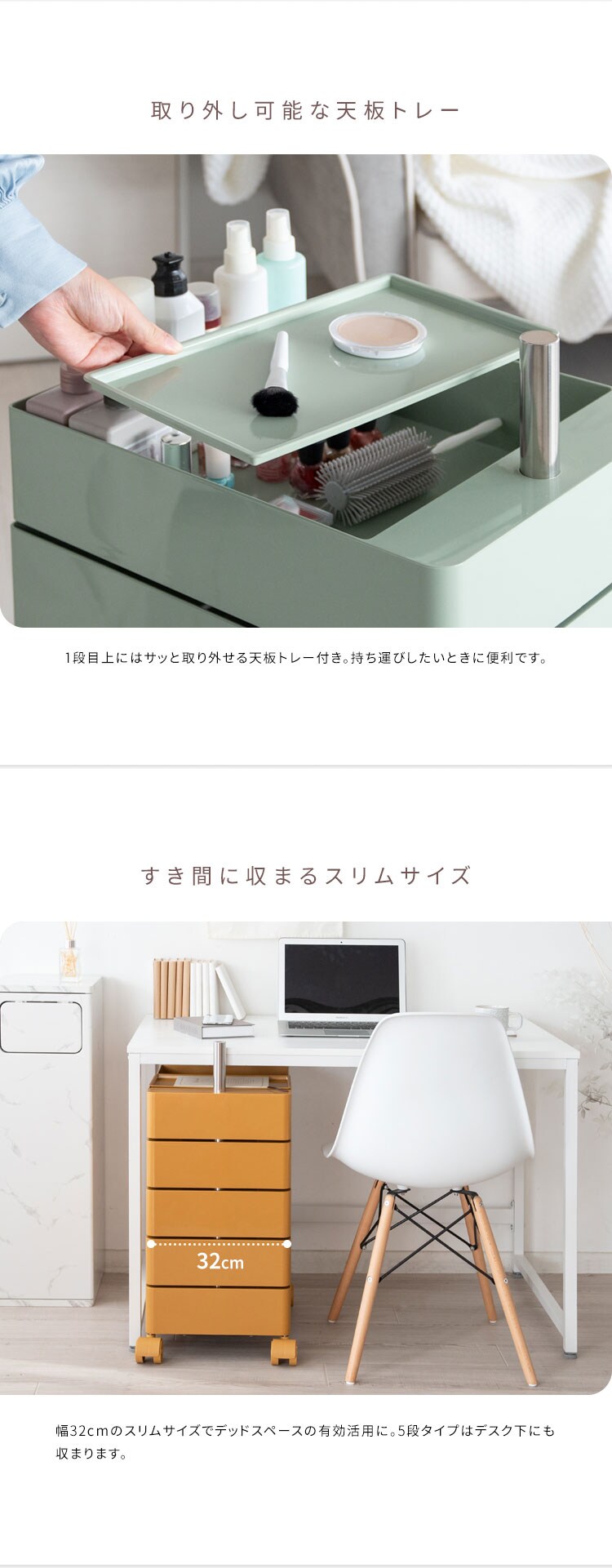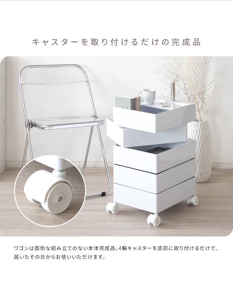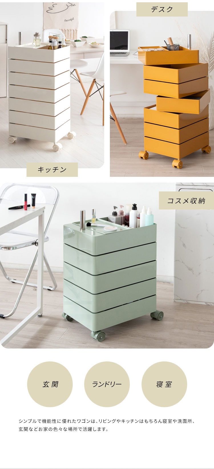 4輪キャスターでラクラク移動できます。棚はそれぞれ360度回転式で取り出しやすく、リビングや寝室、デスクなど色々なシーンでマルチにお使いいただけます。ベビー用品の収納にもオススメ。