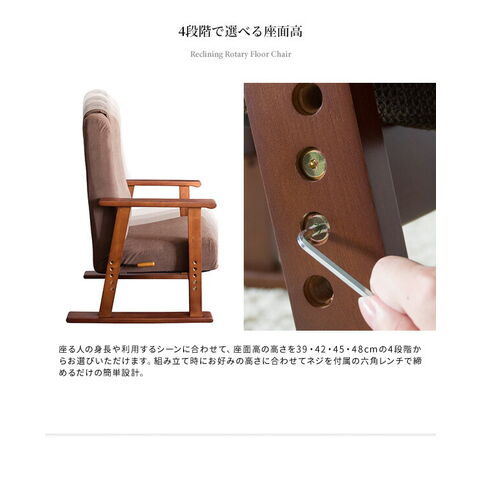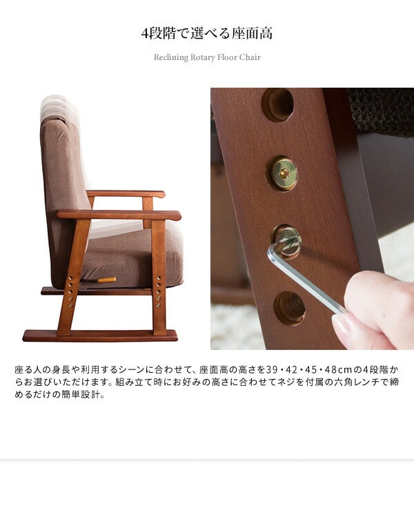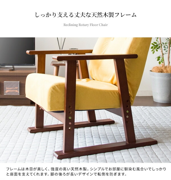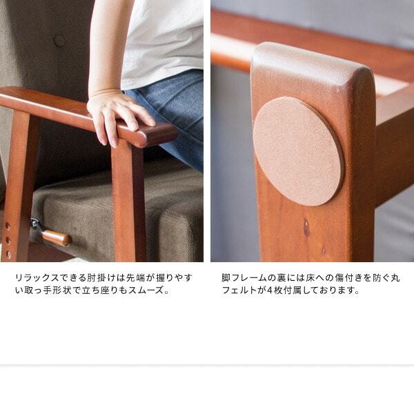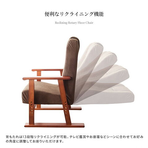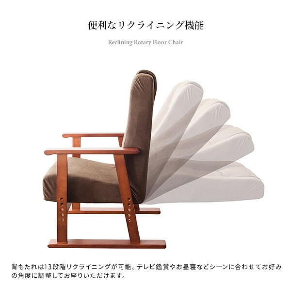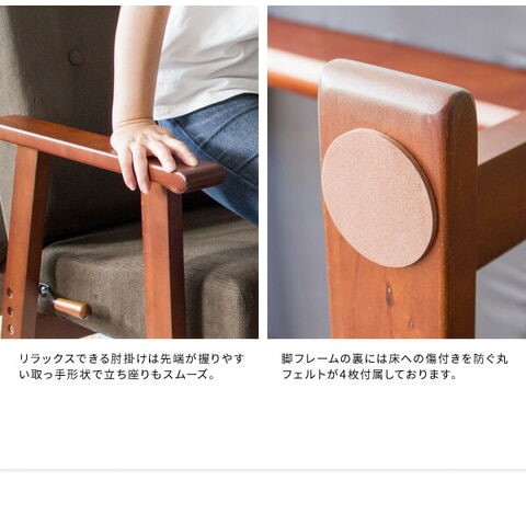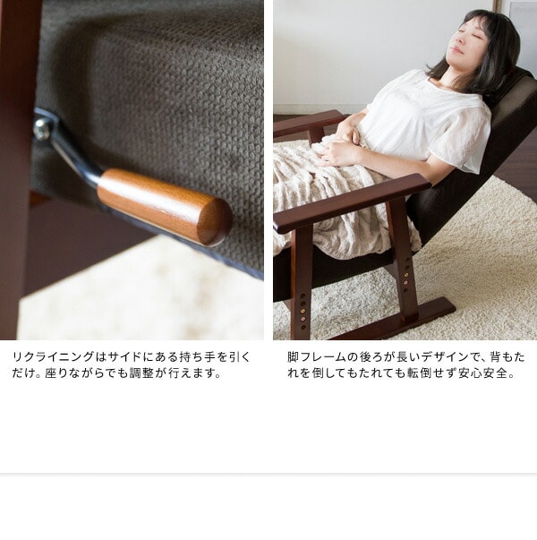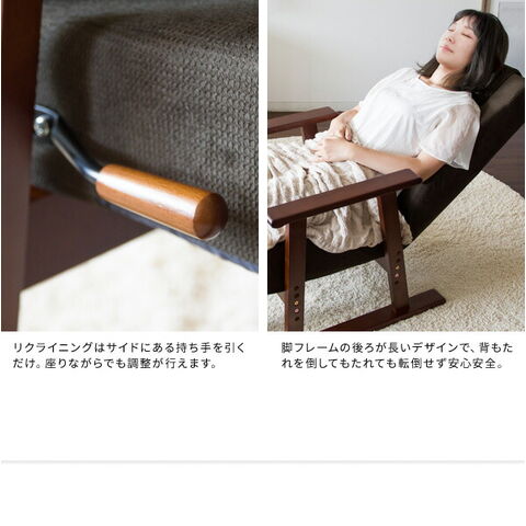 ゆとりのあるハイバックの背もたれと13段階リクライニングで読書やテレビ鑑賞、お昼寝などお好みの角度に調節してゆったりおくつろぎいただけます。丈夫な肘掛け付き天然木フレームで立ち座りもラクラク。