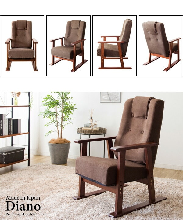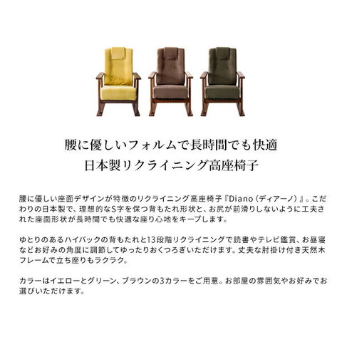腰に優しい座面デザインが特徴のリクライニング高座椅子「Diano(ディアーノ)」。こだわりの日本製で、理想的なS字を保つ背もたれ形状と、お尻が前滑りしないように工夫された座面形状が長時間でも快適な座り心地をキープします。