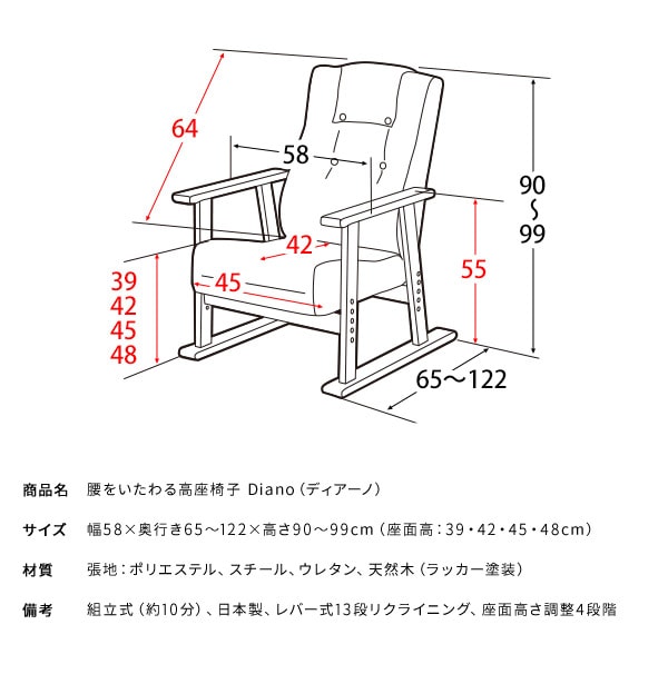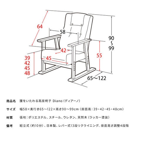 日本製 高座椅子 腰をいたわる高座椅子 Diano ディアーノ 4段階調整 レバー式 13段階リクライニング 高さ調整 座椅子 チェア【送料無料】