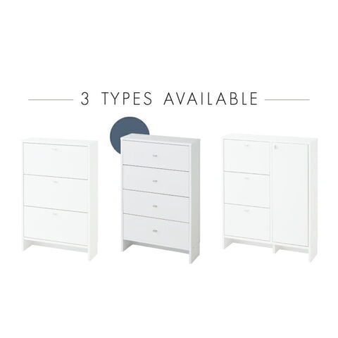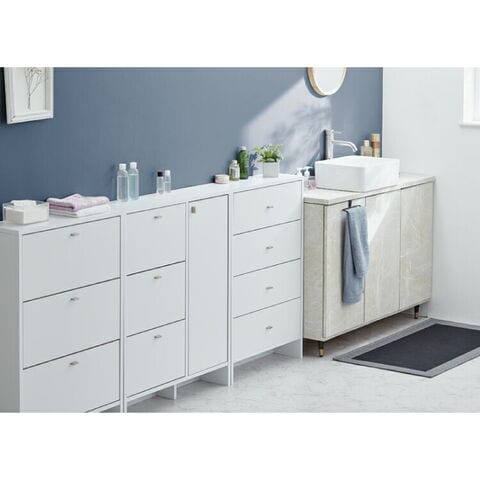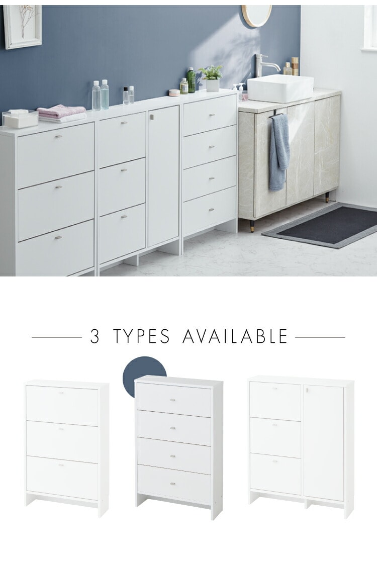 上から中身が見えて整理がしやすいフラップタイプ、小物や洗面用具などの収納に便利な引き出しタイプ、収納物の高さに合わせて高さを調節できる棚板付きの扉収納付きタイプ。
