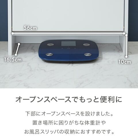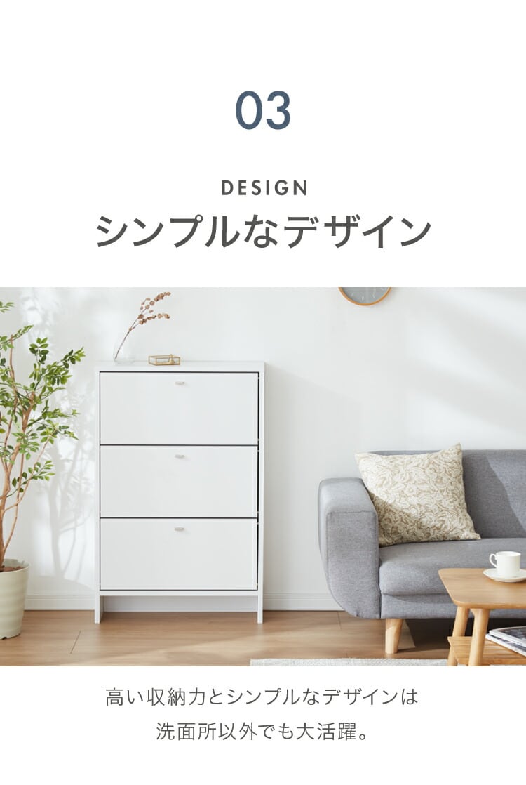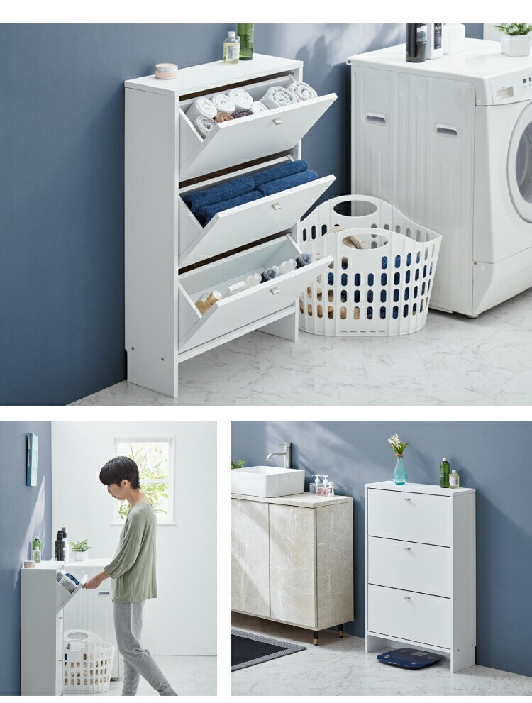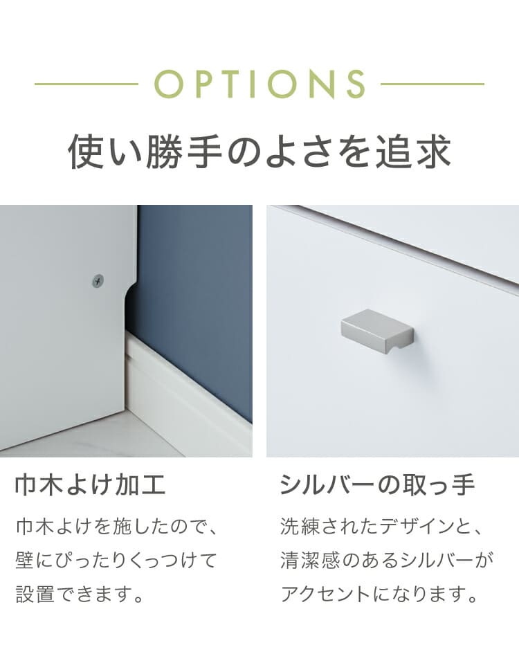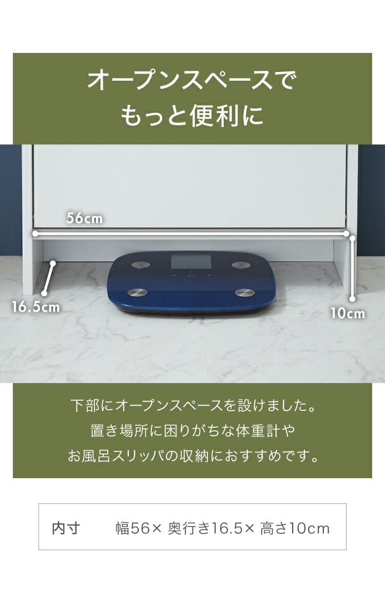 上から中身が見えて整理がしやすいフラップタイプ、小物や洗面用具などの収納に便利な引き出しタイプ、収納物の高さに合わせて高さを調節できる棚板付きの扉収納付きタイプ。