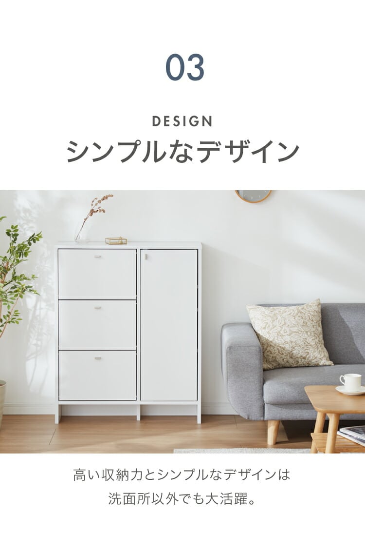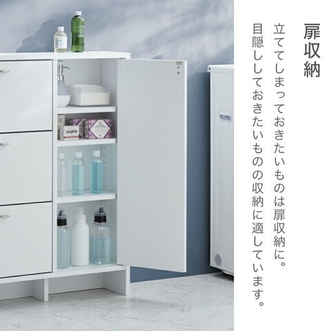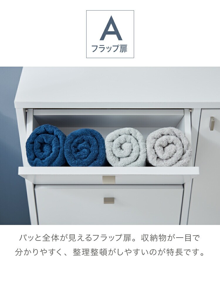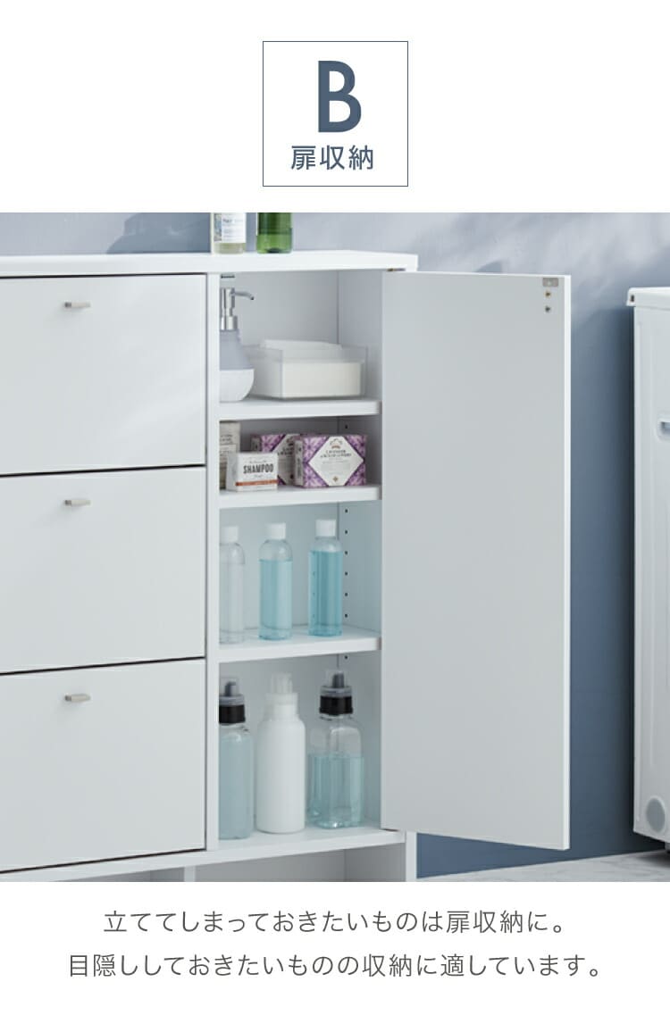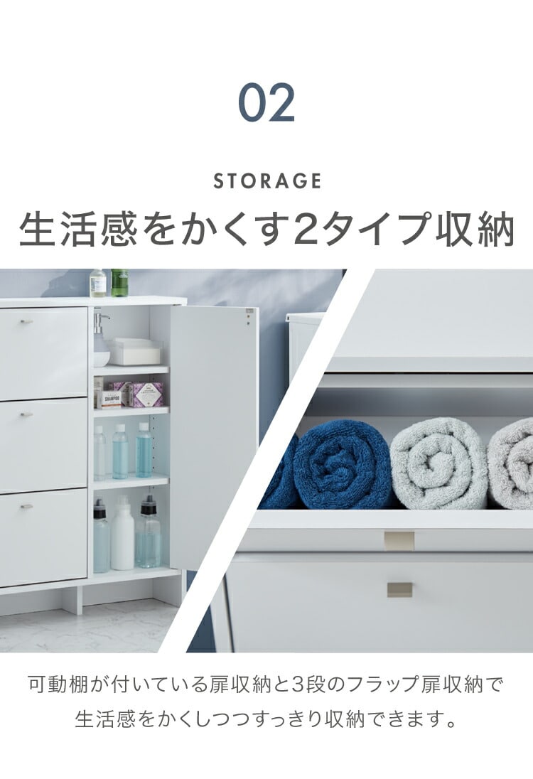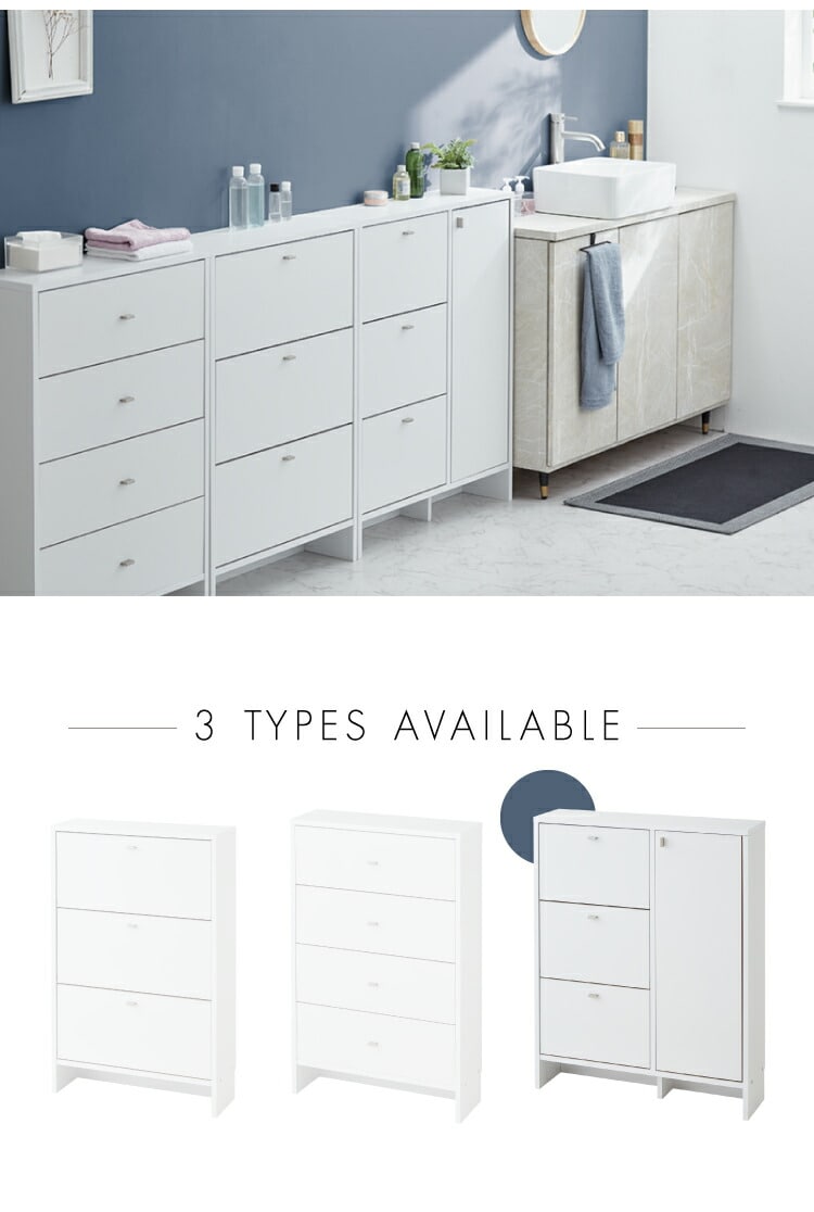 上から中身が見えて整理がしやすいフラップタイプ、小物や洗面用具などの収納に便利な引き出しタイプ、収納物の高さに合わせて高さを調節できる棚板付きの扉収納付きタイプ。