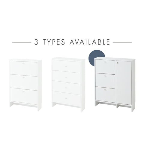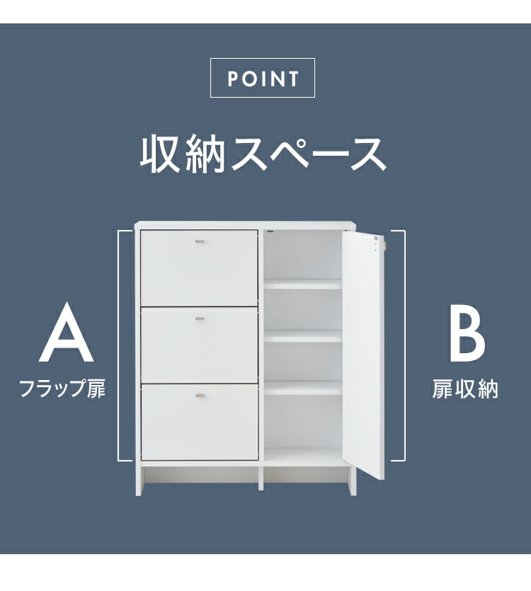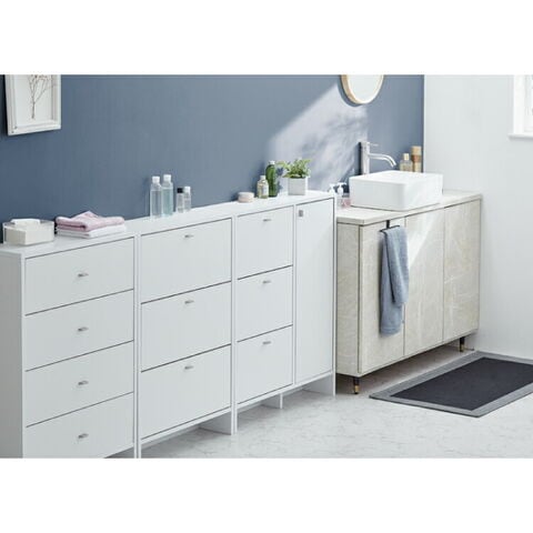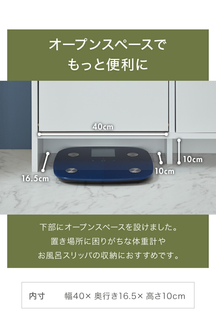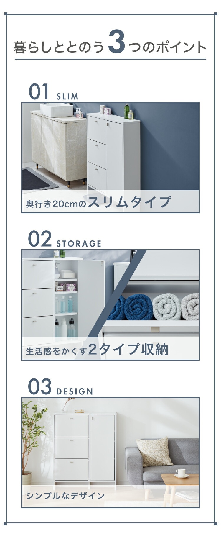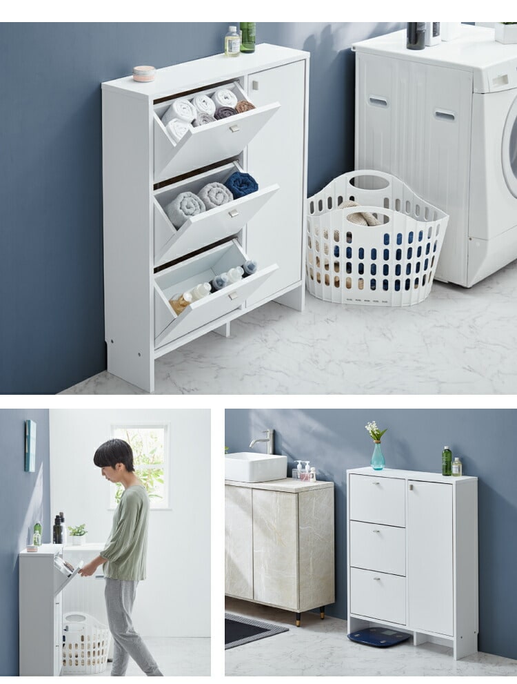 上から中身が見えて整理がしやすいフラップタイプ、小物や洗面用具などの収納に便利な引き出しタイプ、収納物の高さに合わせて高さを調節できる棚板付きの扉収納付きタイプ。