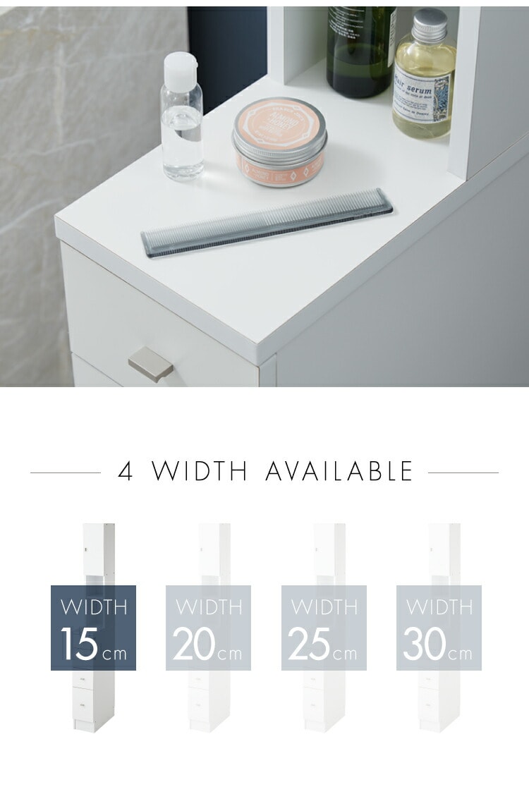 わずかなすき間にも設置できる、幅15cmから30cmまで4タイプ揃えたすき間収納シリーズ。