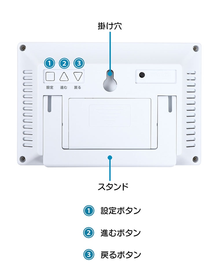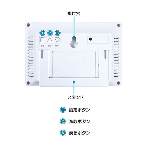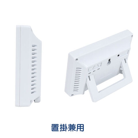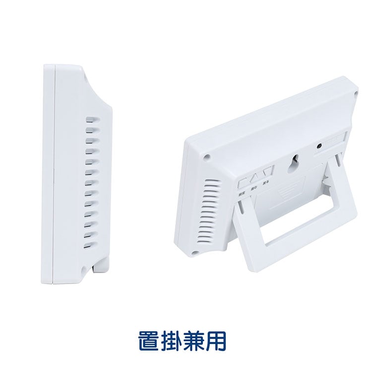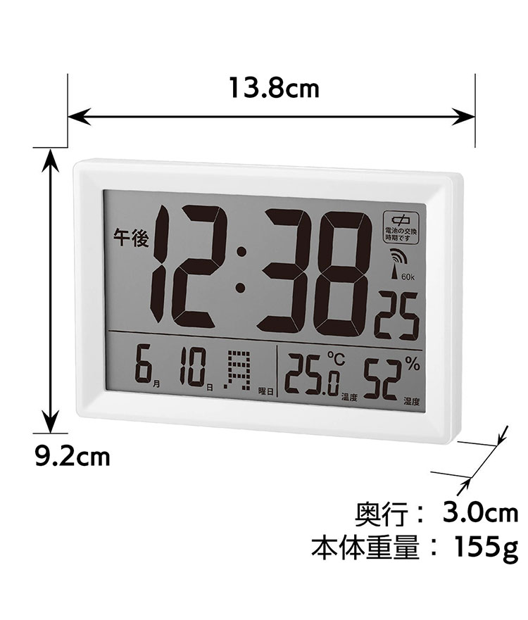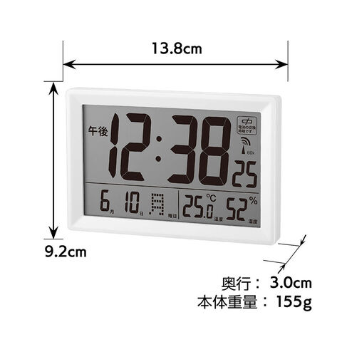 電波時計(JJY)、置掛兼用、時刻表示、カレンダー表示、温度/湿度表示、電波受信状況表示、受信マーク、12/24時間表示切替、電池交換お知らせ表示
