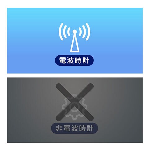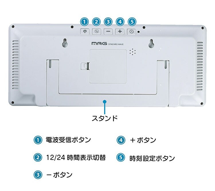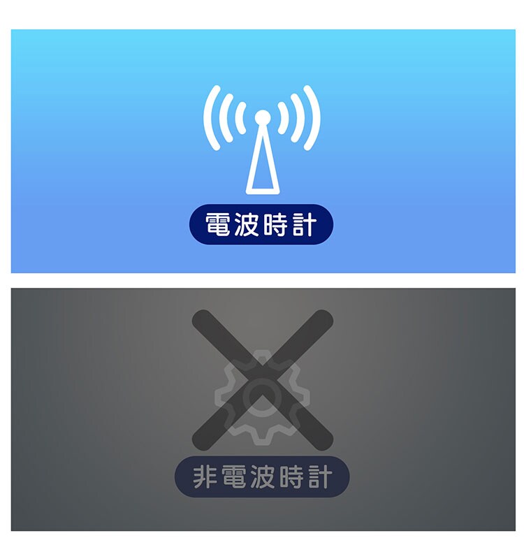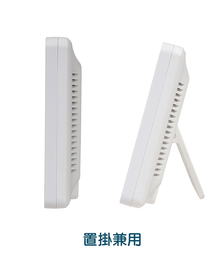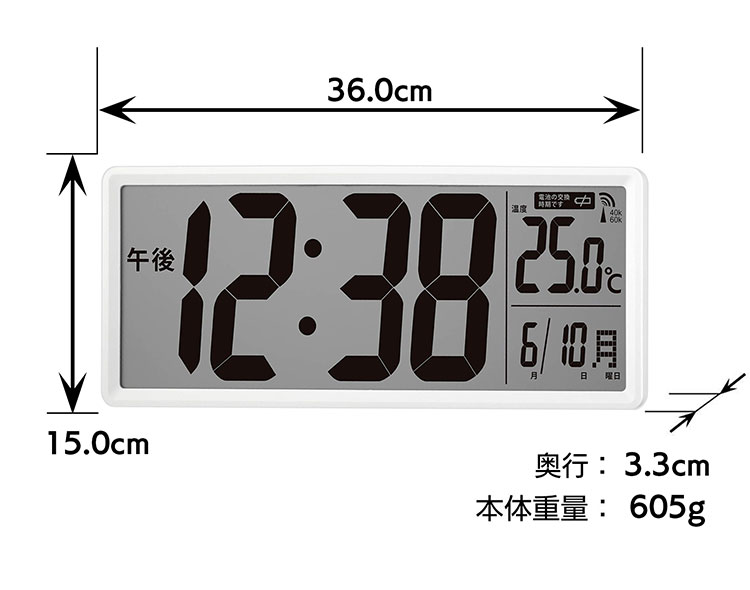 電波時計(JJY)、置掛両用、時刻表示、カレンダー表示、温度表示、電波受信状況表示、受信マーク、12/24時間表示切替、電池交換お知らせ表示