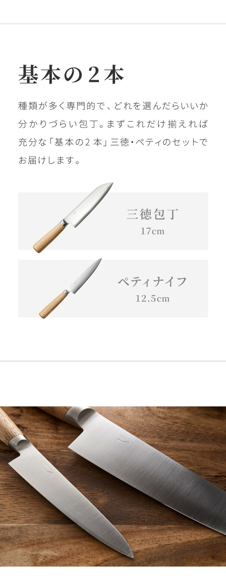 まずこれだけ揃えれば充分という「基本の2本」三徳・ペティのセットです。