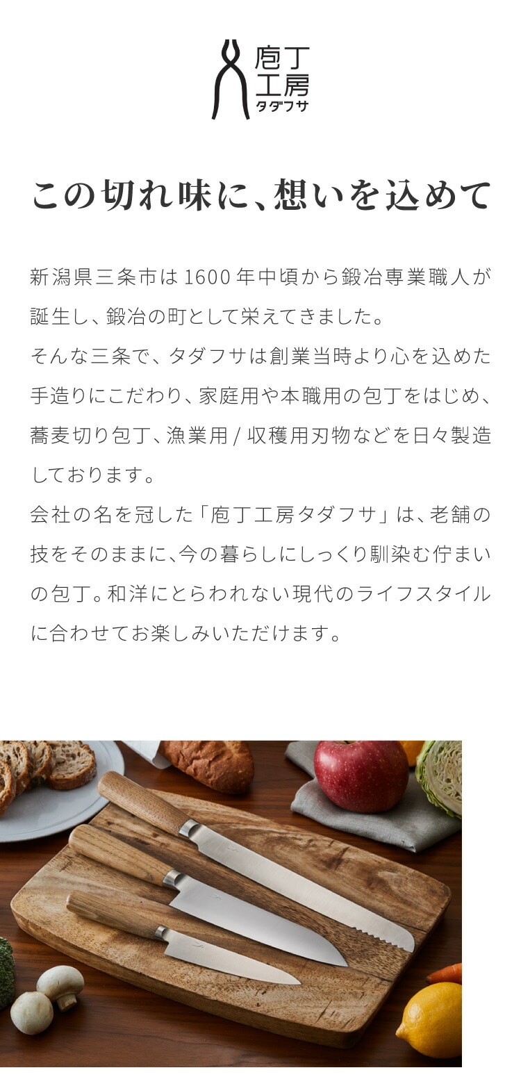 ●「庖丁工房タダフサ」の庖丁は、オールステンレスの庖丁に比べ、鋭い切れ味をお楽しみいただける分、普段の手入れに少々注意が必要となります。切れ刃には鋼(SLD鋼)を採用しているため、手入れや保管環境によって錆びが発生する場合があります。手入れや保管環境によっては、一晩でも錆びが発生することもあります。心地よい切れ味とともに、お手入れや研ぎ直しもあわせてお楽しみください。