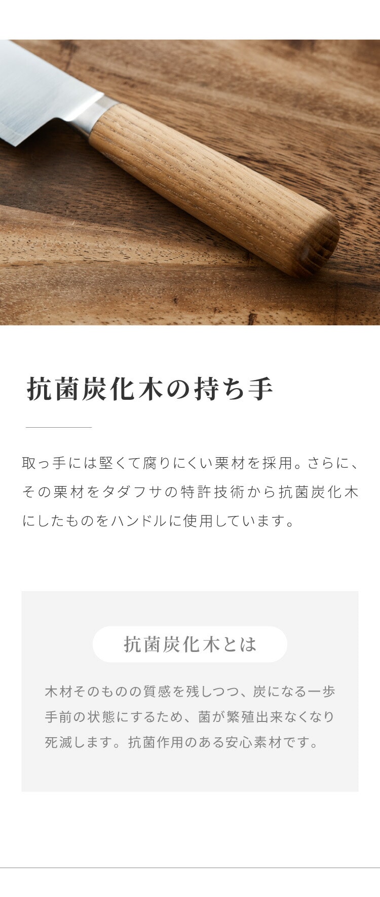 堅くて腐りにくい栗材。さらに、その栗材をタダフサの特許技術から生まれた炭化木にしたものをハンドルに使用しています。木材そのものの質感を残した炭化木は、炭の一歩手前の状態にして菌が繁殖出来なくなり死滅してしまう木材です。