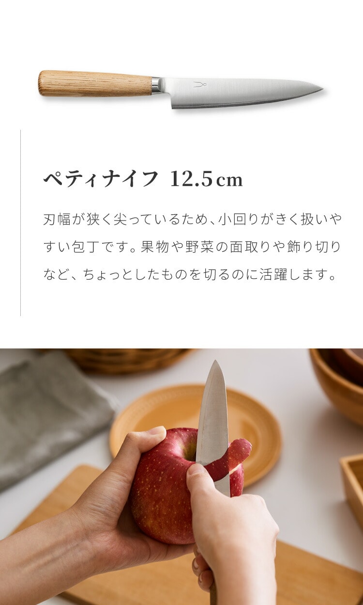 ジャガイモや人参の面取り、野菜の飾り切りなど、大きな庖丁では面倒な細工もこのペティナイフがあれば簡単にできます。小回りがきく扱いやすい庖丁は1本あると、とても便利です。