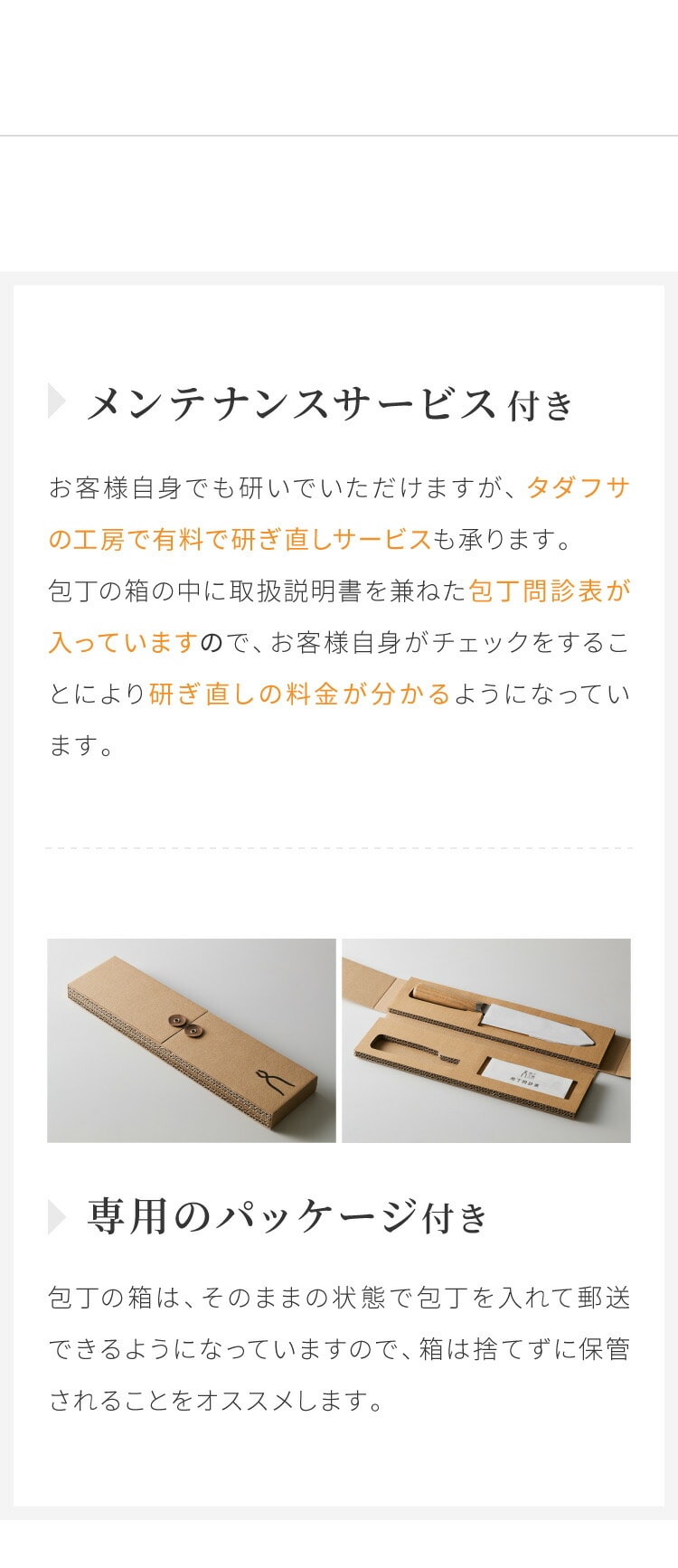 お客様自身でも研いでいただけますが、タダフサの工房で有料で研ぎ直しのサービスも承ります。庖丁の箱の中に取扱説明書を兼ねた「庖丁問診表」が入っていますので、お客様自身がチェックをする事により研ぎ直しの料金が分かるようになっています。