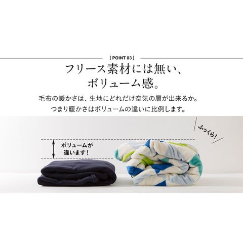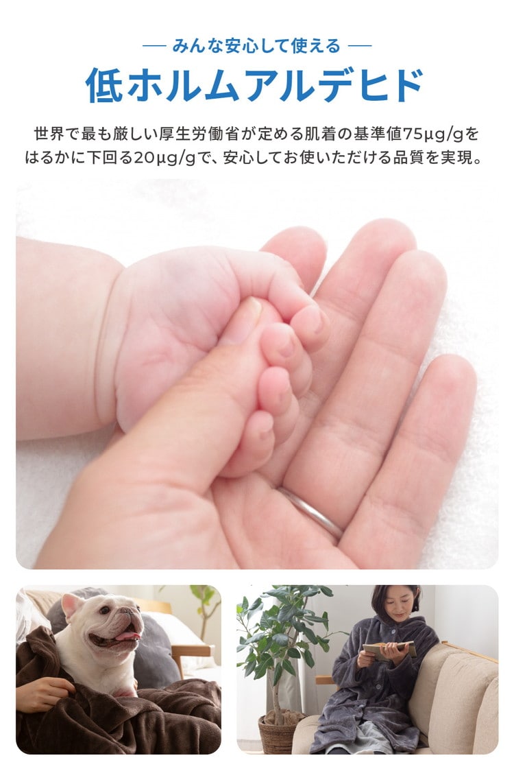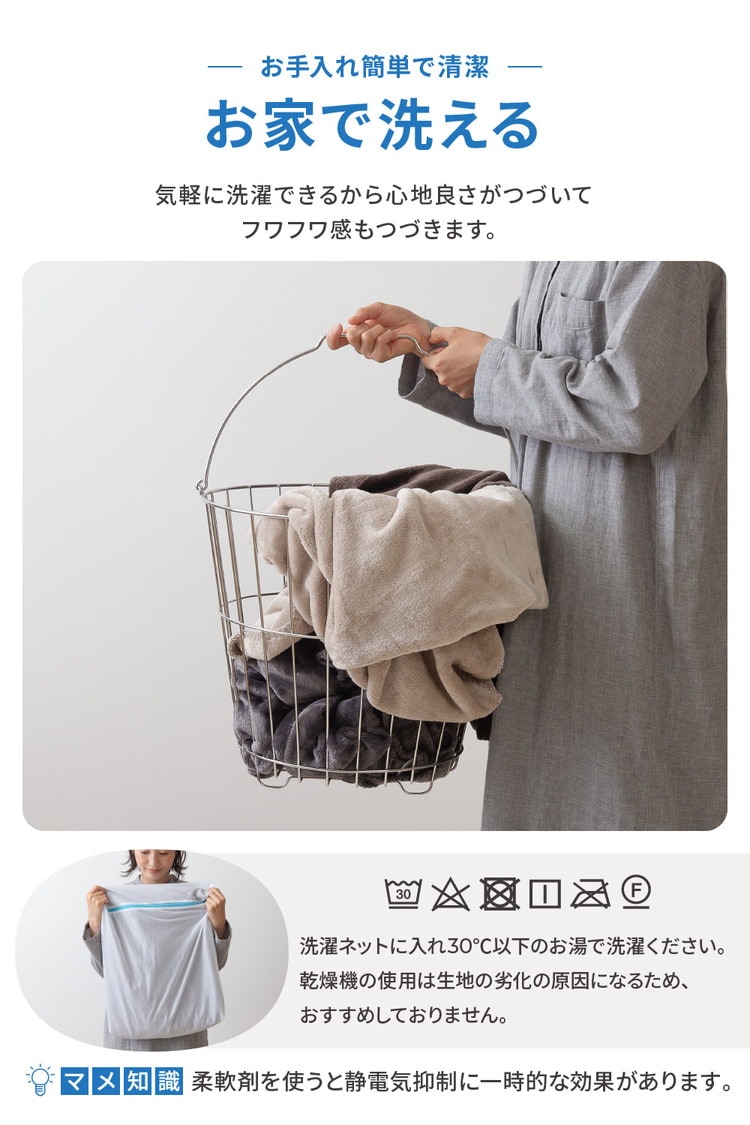 | その他 | ・毛羽が燃えやすいので火に近づけないでください。 ・手洗いの際は、多少の色落ちや毛羽落ちが考えれますので単独にてお洗いください。 ・塩素系漂白剤は脱色変色をきたすことがありますので絶対に使用しないでください。 ・ご使用時の摩擦や洗濯時に毛並みが乱れた場合は、早めに一方向にブラシを掛けてください。 ・乾燥機のご使用はお避けください。 |