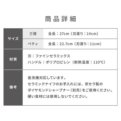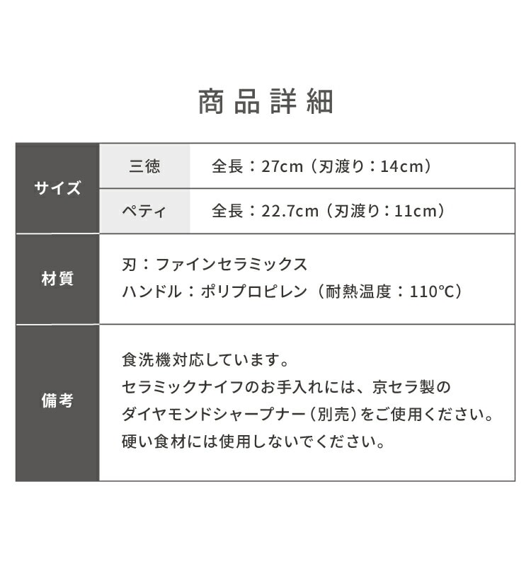 セラミックナイフのお手入れには、京セラ製ダイヤモンドシャープナー(別売)をご使用ください。