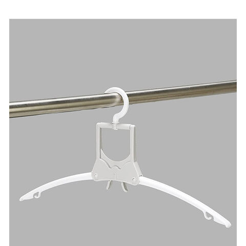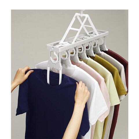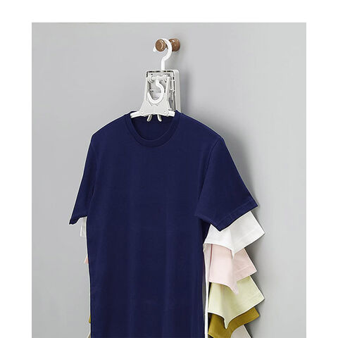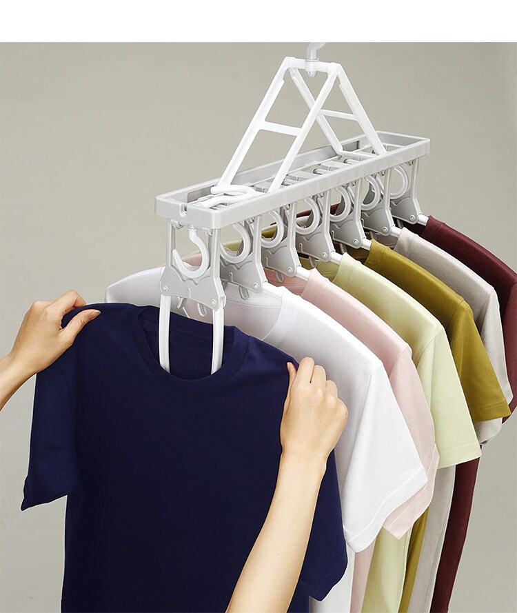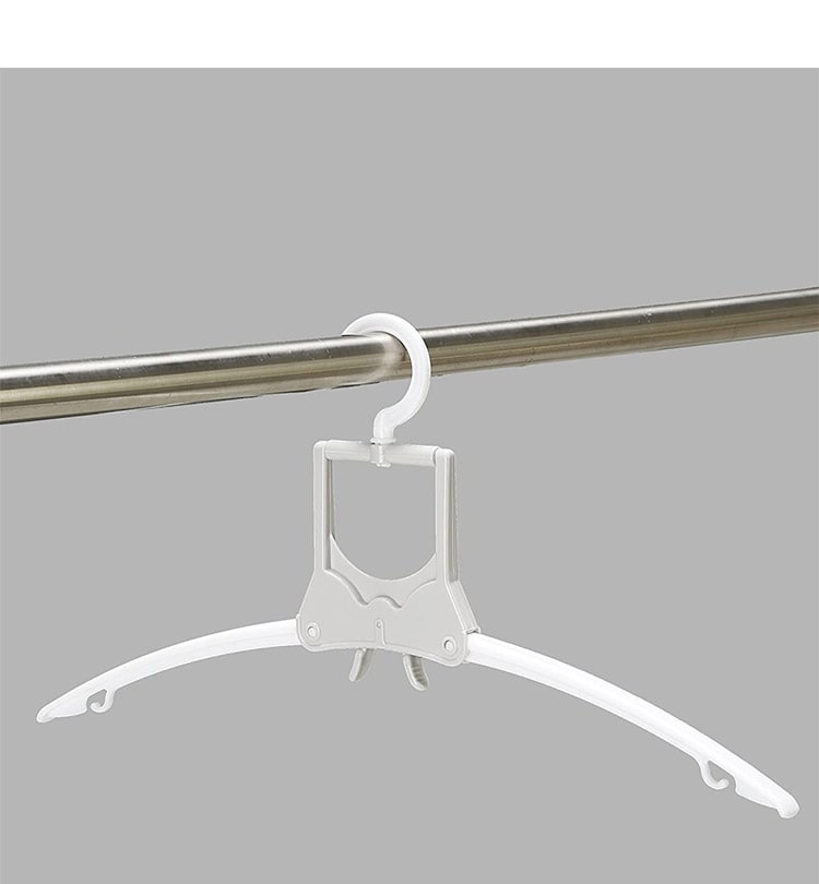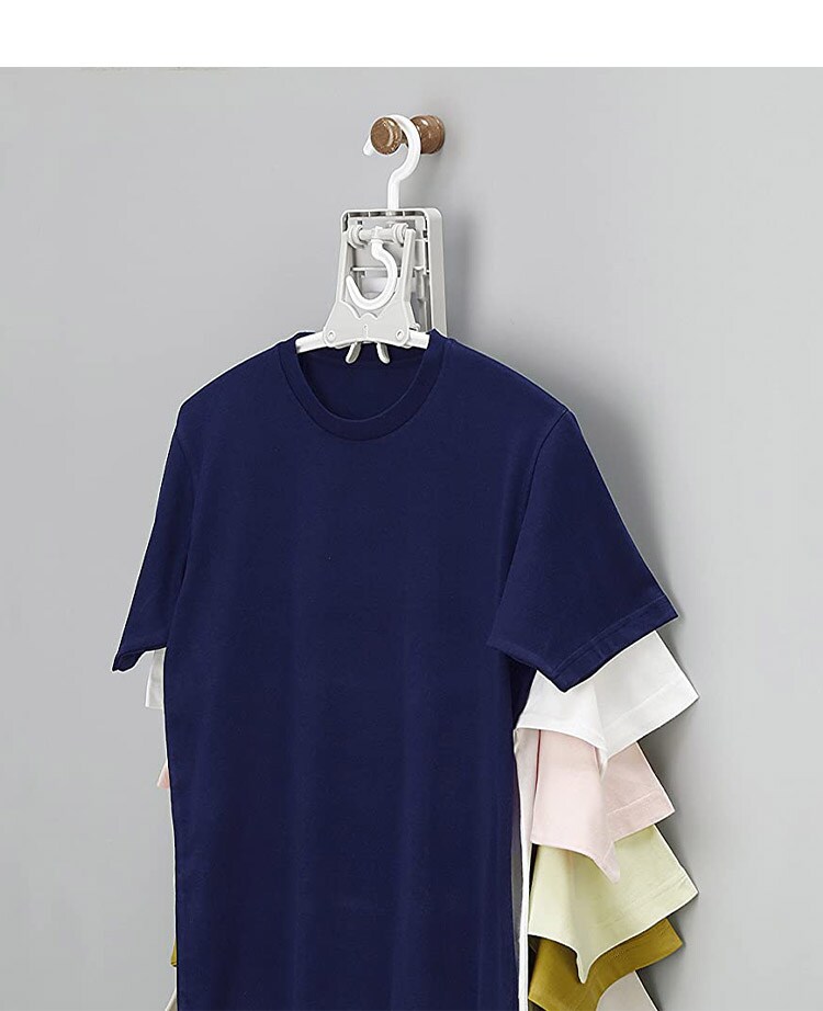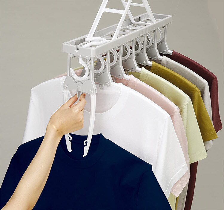 折りたたみ式のハンガーなのでTシャツなどの首元から差し込め、伸ばさずに簡単に干せます。取り入れもつまみをつまめばワンタッチで取り込めます