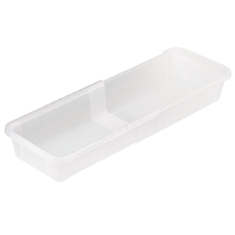 伸縮式トレーでカトラリーをきれいに整理整頓。引き出しやカトラリーのサイズに合わせて伸縮可能なトレー。2サイズ展開なので用途に合わせてご使用いただけます。清潔感のあるホワイト・クリアの2色展開。文房具などの小物にも!引き出しの中を整理整頓。