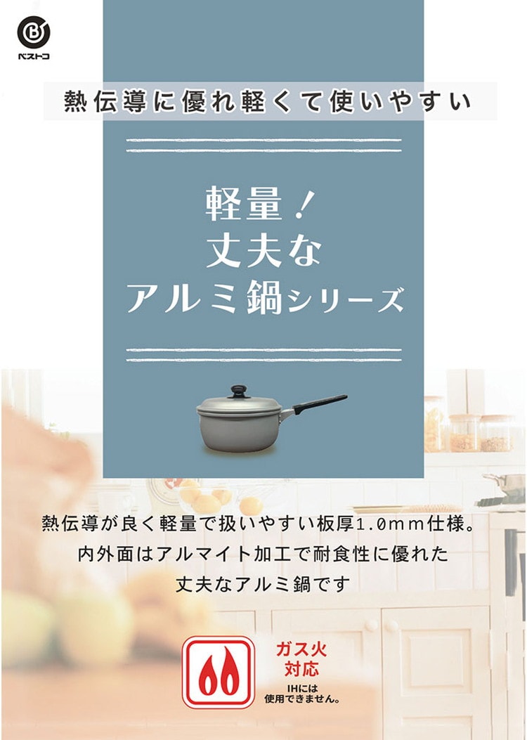 軽くてあつかいやすい!煮込み料理にも。熱伝導性が良く軽くて使いやすいアルミ鍋です。アルマイト加工なので、きれいさが長持ちします。ガス火対応。IHには使用できません。
