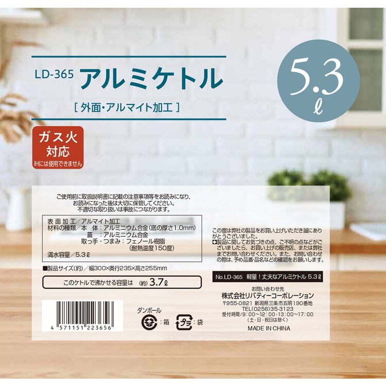 リバティーコーポレーション やかん ケトル 5.3L アルミ ガス火専用 軽量 丈夫 LD-365【送料無料】