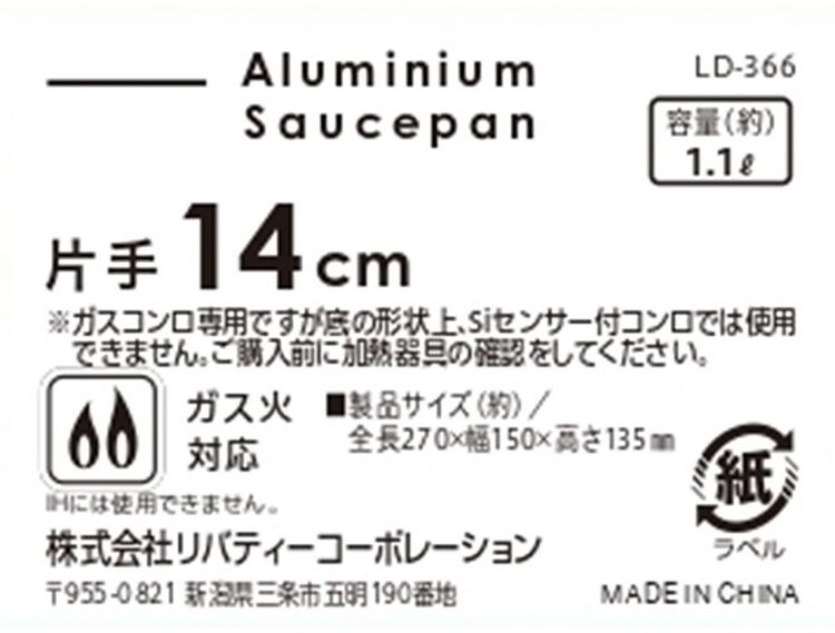 リバティーコーポレーション 片手鍋 14cmアルミ 軽量 ガス火専用 LD-366【送料無料】