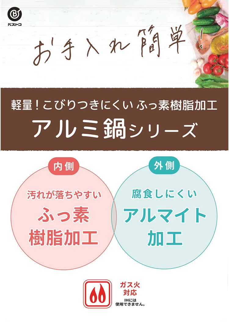 軽量!こびりつきにくいふっ素樹脂加工。機能性が高いアルミ鍋シリーズ!内面は汚れが落ちやすく、お手入れ簡単なふっ素樹脂加工。外面は腐食しにくいアルマイト加工。ガス火対応。IHには使用できません。