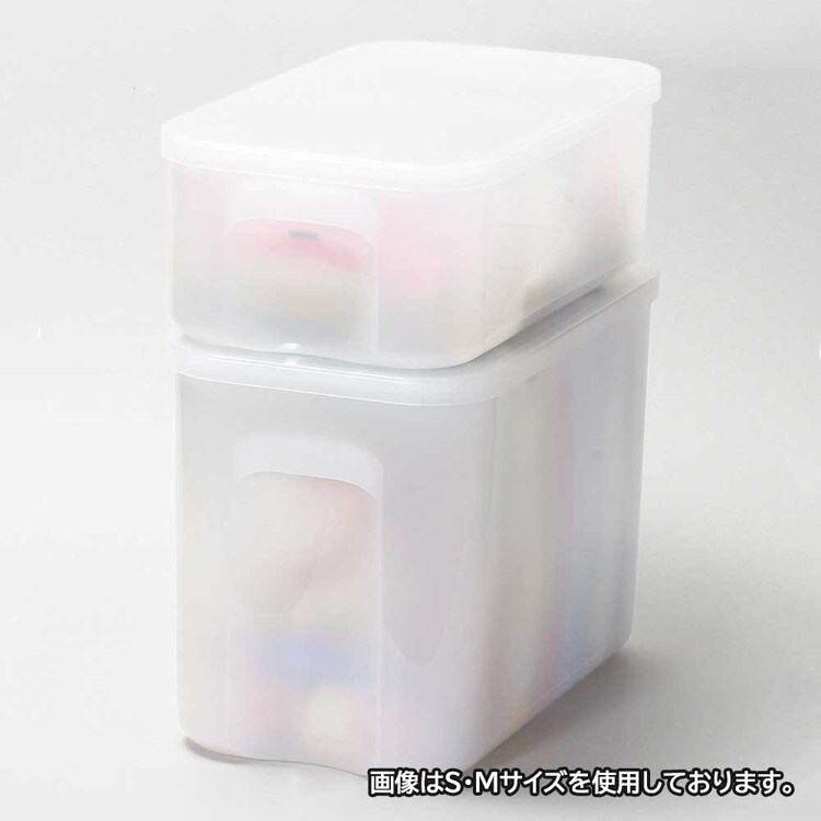 クリア・ホワイト・ワームグレーの3色展開シンプルで使う場所を選ばない収納ケース。ソフトな素材で扱いやすい。食品のストックから日用品・おもちゃの収納まですっきり片付く。両サイドに持ち手が付いているので、収納した際も取り出しやすい。フラットな形状の蓋付なので、スタッキング可能で便利です。