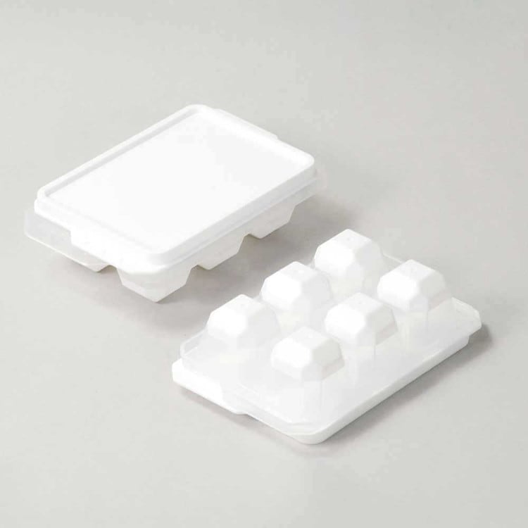 底面がやわらかく氷がとりやすい蓋付アイストレー。匂いうつりしにくいため、色々な味の氷を作るのにも最適です。底面がやわらかいので、ギュッと軽く押すだけで、ポンッと氷が取りやすい。一人暮らし等、狭い冷凍庫内の省スペースでコンパクトに氷が作れる。フタ付きで重ねて使えるので、スペースを有効活用できます。