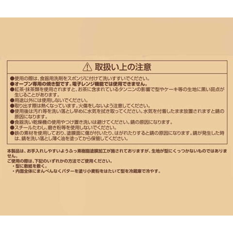 ※本製品は、お手入れしやすいようふっ素樹脂塗膜加工が施されておりますが、生地が型にくっつかないものではありません。ご使用の際は、下記いずれかの方法でご使用ください。