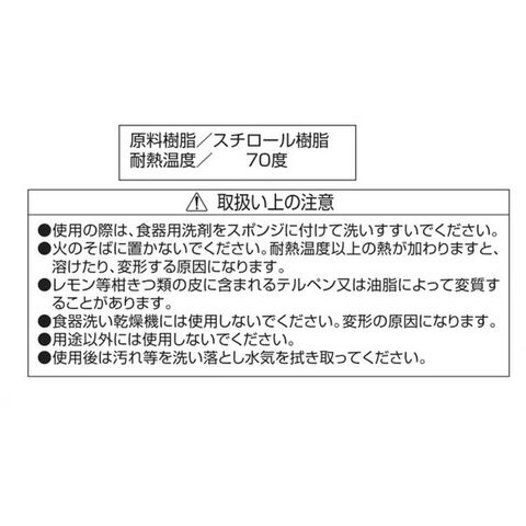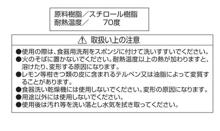 原料樹脂/スチロール樹脂、耐熱温度/70度