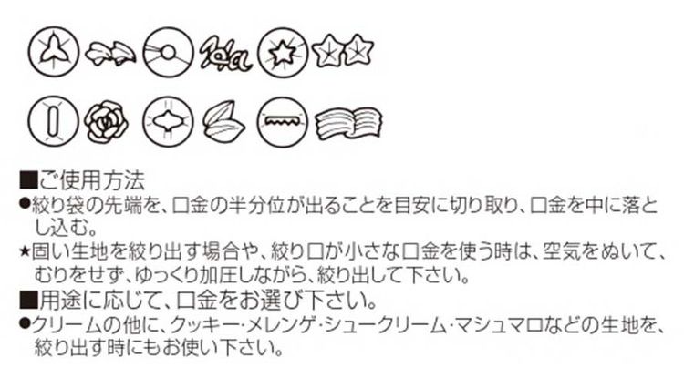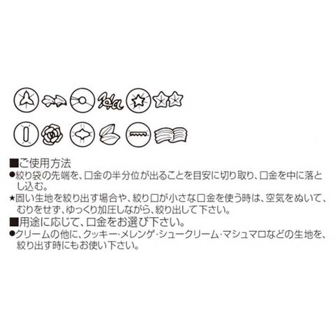 クリームの他に、クッキー・メレンゲ・シュークリーム・マシュマロなどの生地を絞り出す時にもお使い下さい。
