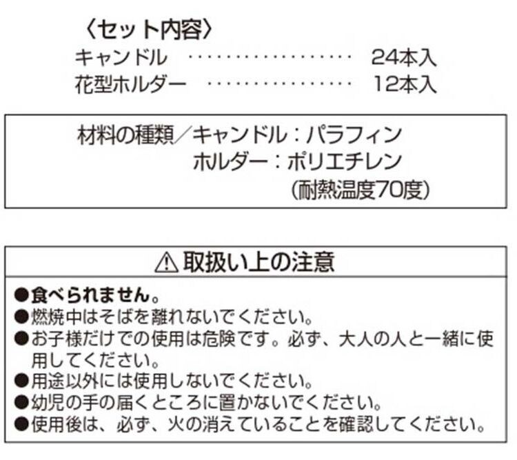 材料の種類/キャンドル:パラフィン、ホルダー:ポリエチレン(耐熱温度70度)