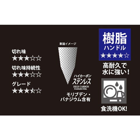 素材・材質:刀身/ハイカーボンステンレス鋼(モリブデン・バナジウム含有)、口金・鋲/ステンレス鋼、ハンドル/ポリアセタール(耐熱温度100度)