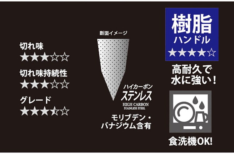 素材・材質:刀身/ハイカーボンステンレス鋼(モリブデン・バナジウム含有)、口金・鋲/ステンレス鋼、ハンドル/ポリアセタール(耐熱温度100度)