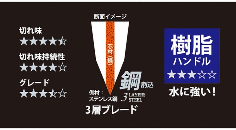 素材・材質:刀身/鋼割込材(芯材/鋼(ハガネ)、側材/ステンレス鋼)、ハンドル/ポリプロピレン(耐熱温度100度)