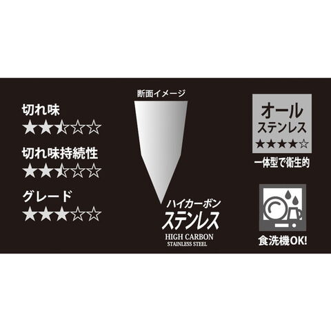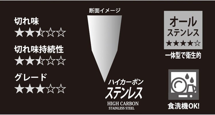 素材・材質:刀身/ハイカーボンステンレス鋼、ハンドル/ステンレス鋼