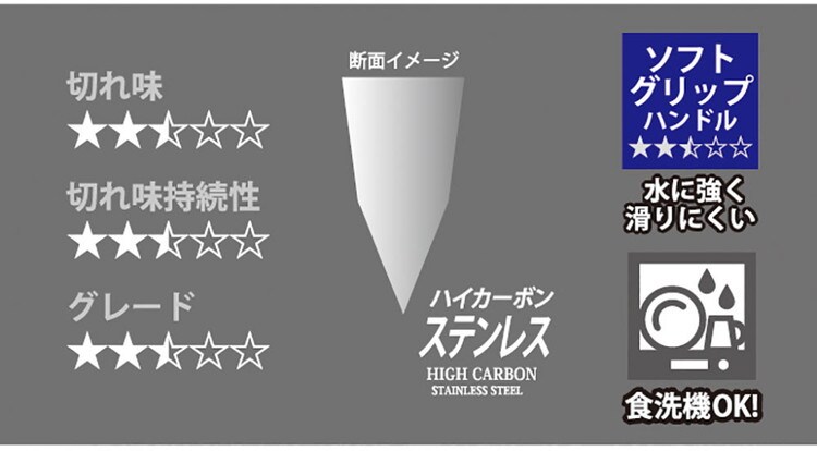 素材・材質:刀身/ハイカーボンステンレス鋼、ハンドル/ポリプロピレン(表面:熱可塑性エラストマー)(耐熱温度100度)
