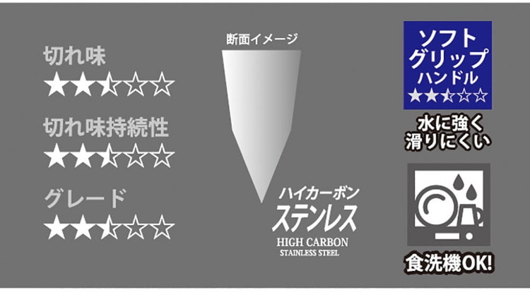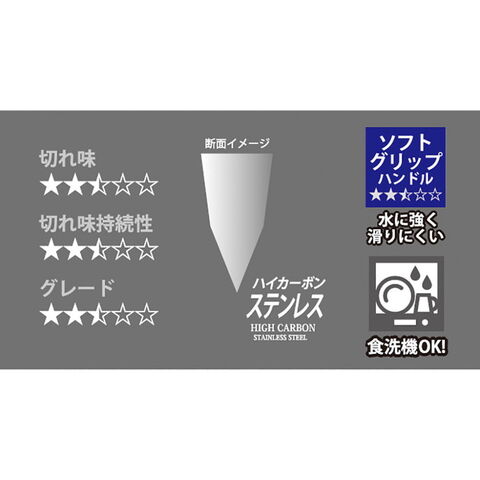 素材・材質:刀身/ハイカーボンステンレス鋼、ハンドル/ポリプロピレン(表面:熱可塑性エラストマー)(耐熱温度100度)