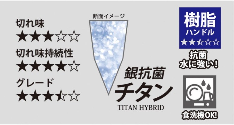 パール金属、銀抗菌、チタン、ふっ素、包丁、水に強い、銀イオン、軽量、金属臭、シンプル、おしゃれ、スタイリッシュ、使いやすい、安心、食洗機可、樹脂ハンドル、握りやすい