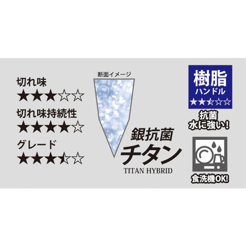 パール金属、銀抗菌、チタン、ふっ素、包丁、水に強い、銀イオン、軽量、金属臭、シンプル、おしゃれ、スタイリッシュ、使いやすい、安心、食洗機可、樹脂ハンドル、握りやすい