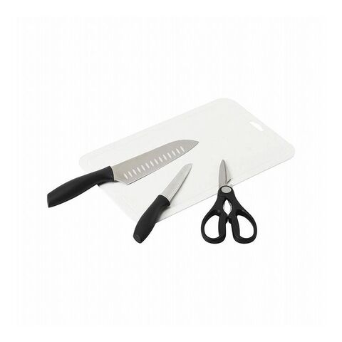 三徳包丁、ペティナイフ、キッチンバサミ、まな板の4点セット。