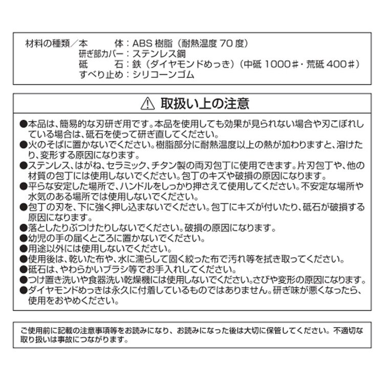 素材・材質:本体/ABS樹脂、研ぎ部カバー/ステンレス鋼、砥石/鉄(ダイヤモンドめっき)(中砥石1000# 荒砥石400#)、すべり止め/シリコーンゴム
