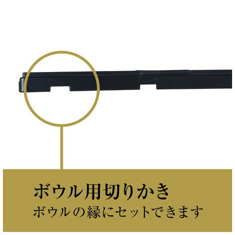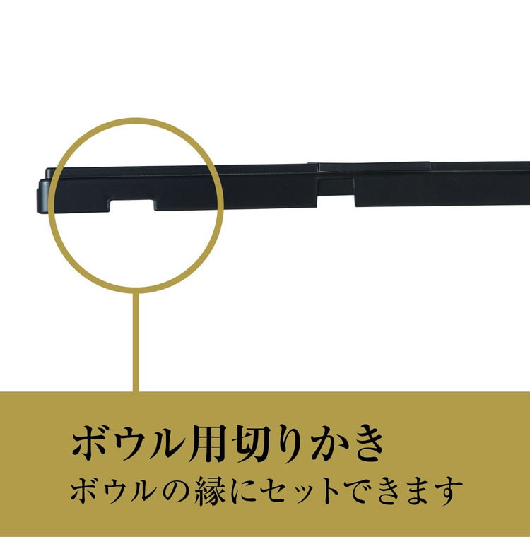 先を直置きして調理する時に滑りにくいように滑り止めと、ボールに載せて調理する時に安定する切り欠き付。
