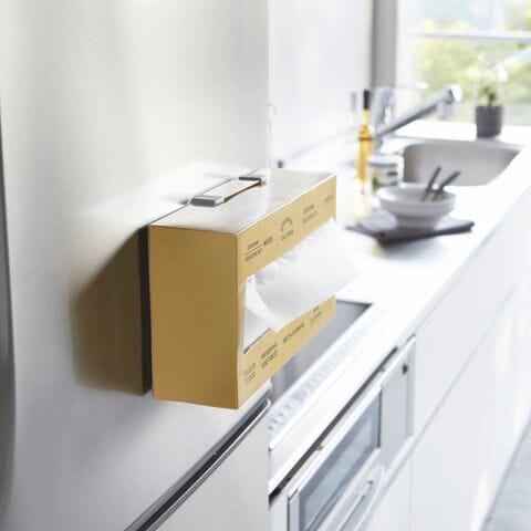 ●上下から箱をはさむだけで、ティッシュ・ペーパータオル・ポリ袋などの箱が冷蔵庫の壁面などに取り付けられます。