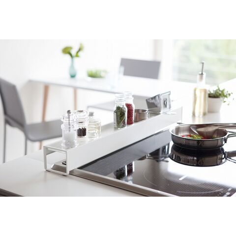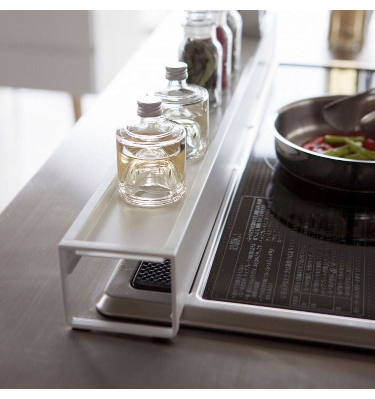 スパイスや調味料などが置けるガード付きの棚で排気口の上を有効活用!グリル使用時は後ろへずらすだけ。