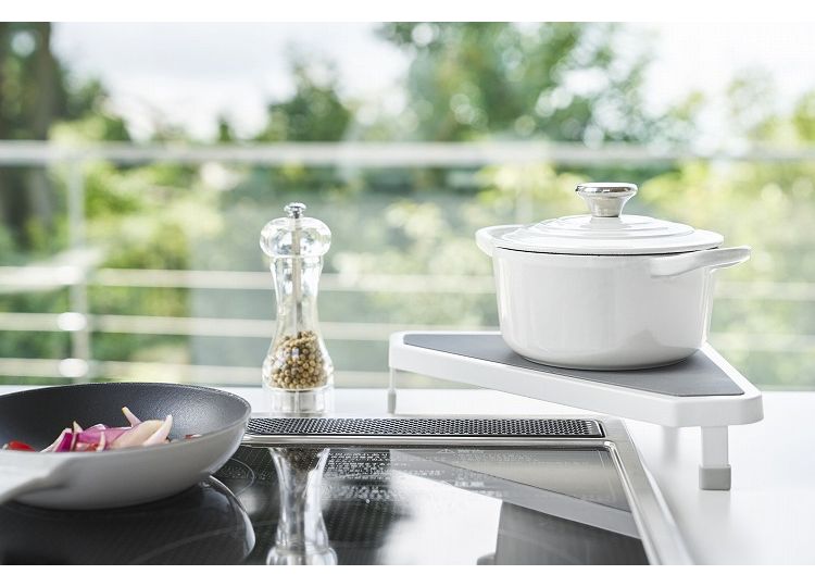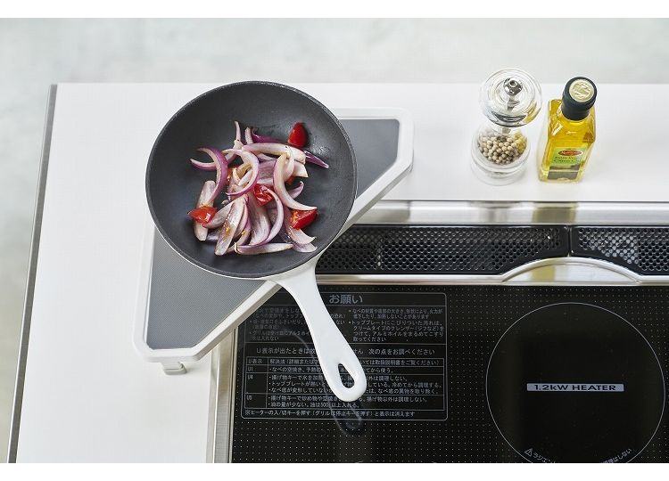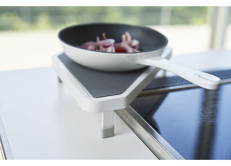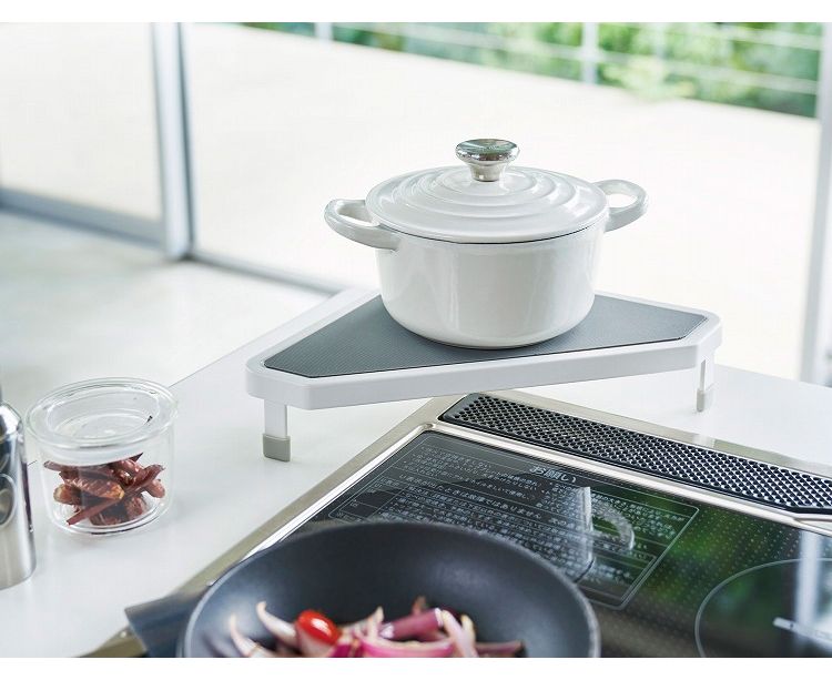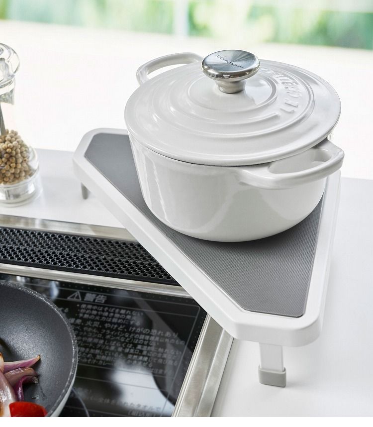 コンロ奥のコーナーを有効利用。鍋やフライパンの一時置きに便利。