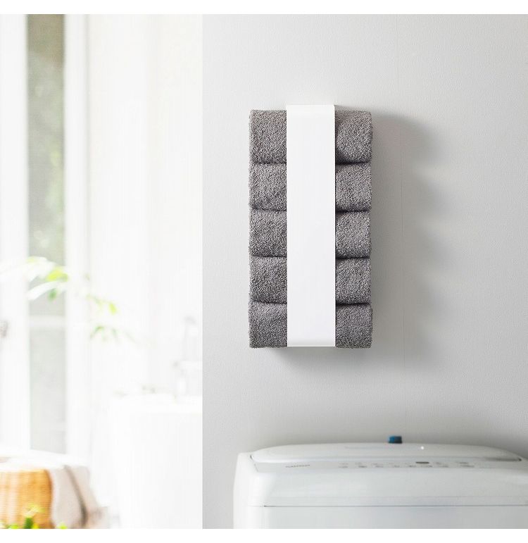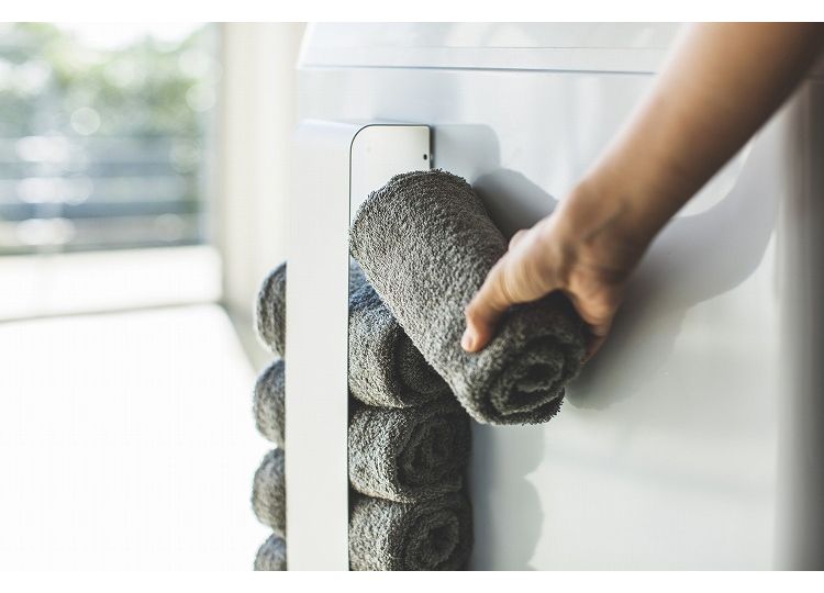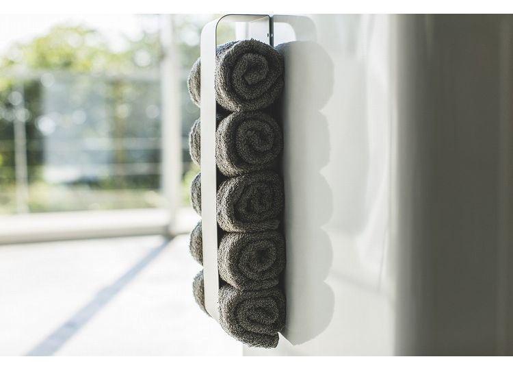 磁石で簡単取り付け。タオルを丸めて洗濯機や冷蔵庫側面などに収納。