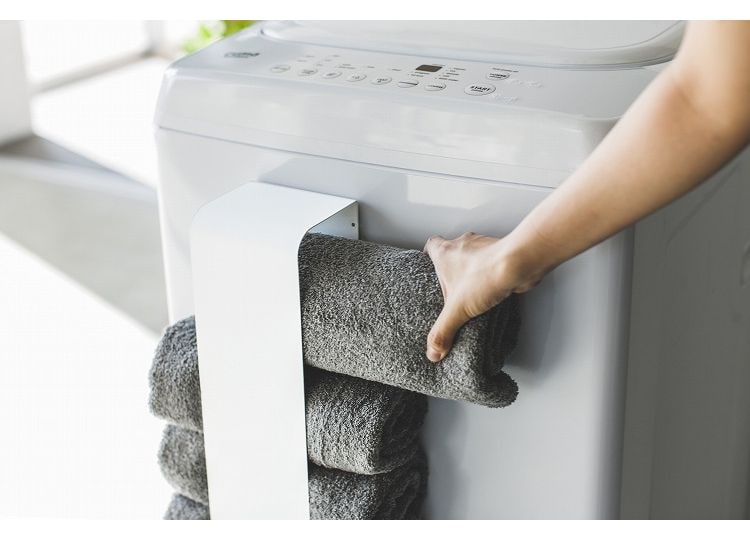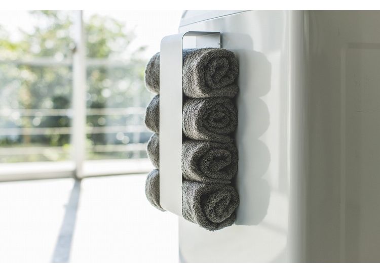 磁石で簡単取り付け。バスタオルを丸めて洗濯機や壁面にすっきり収納。
