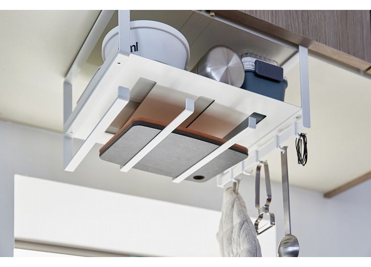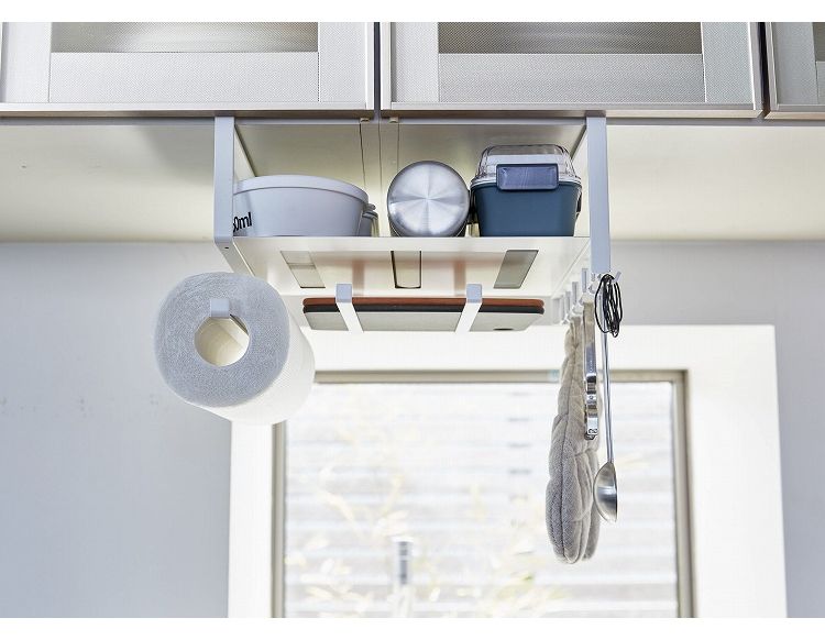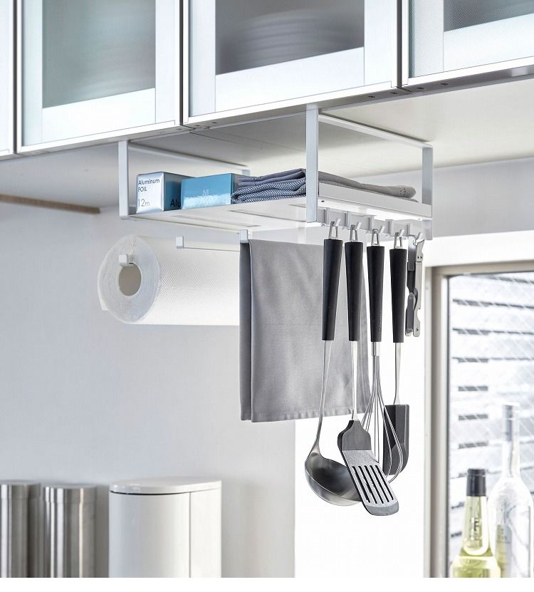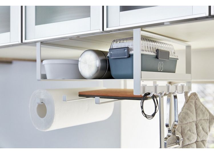 キッチンの吊り戸棚に差し込むだけの収納ラック。あらゆるキッチン小物を一括収納!